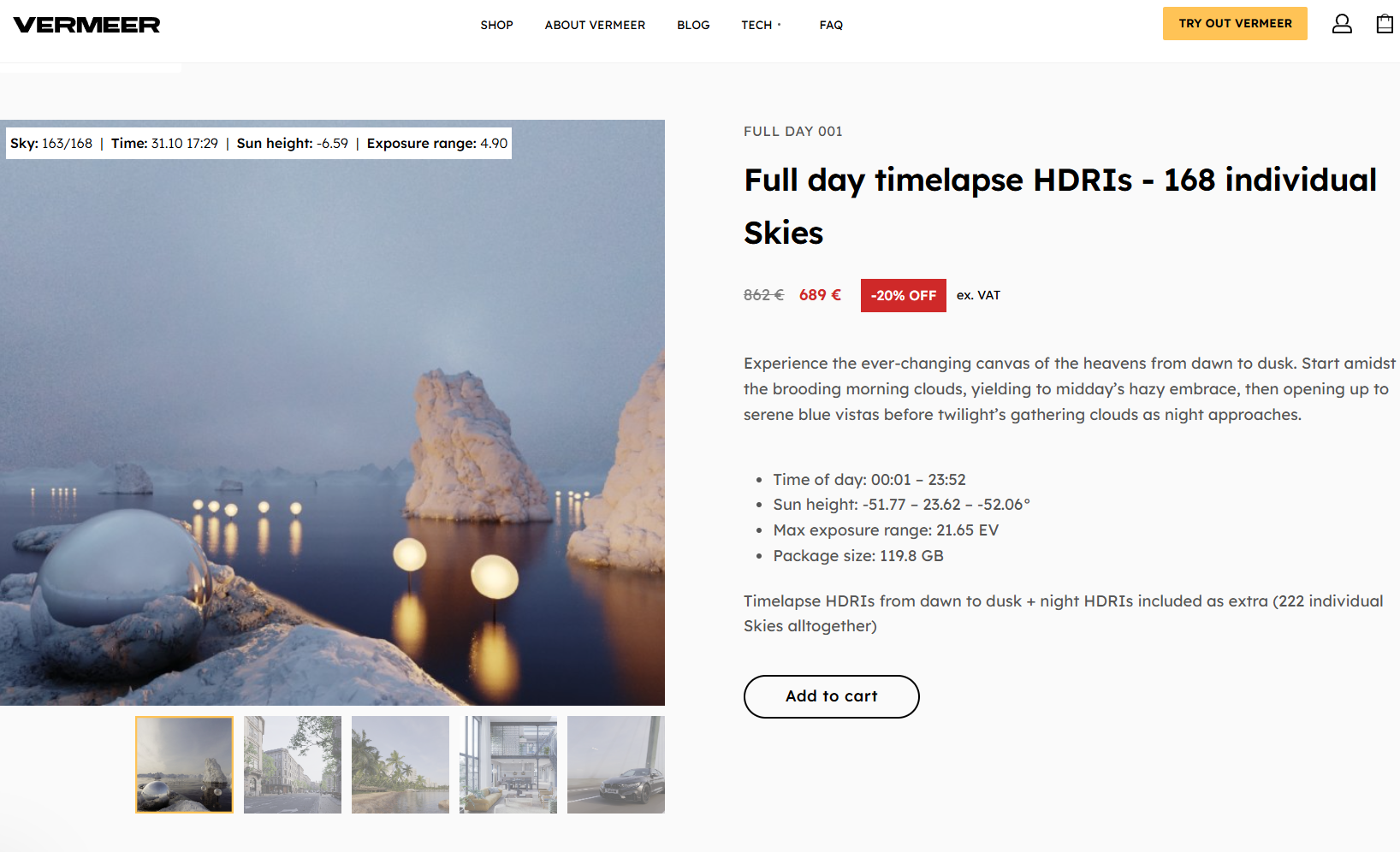 Timelapse HDRIs from dawn to dusk + night HDRIs included as extra (222 individual Skies alltogether)
